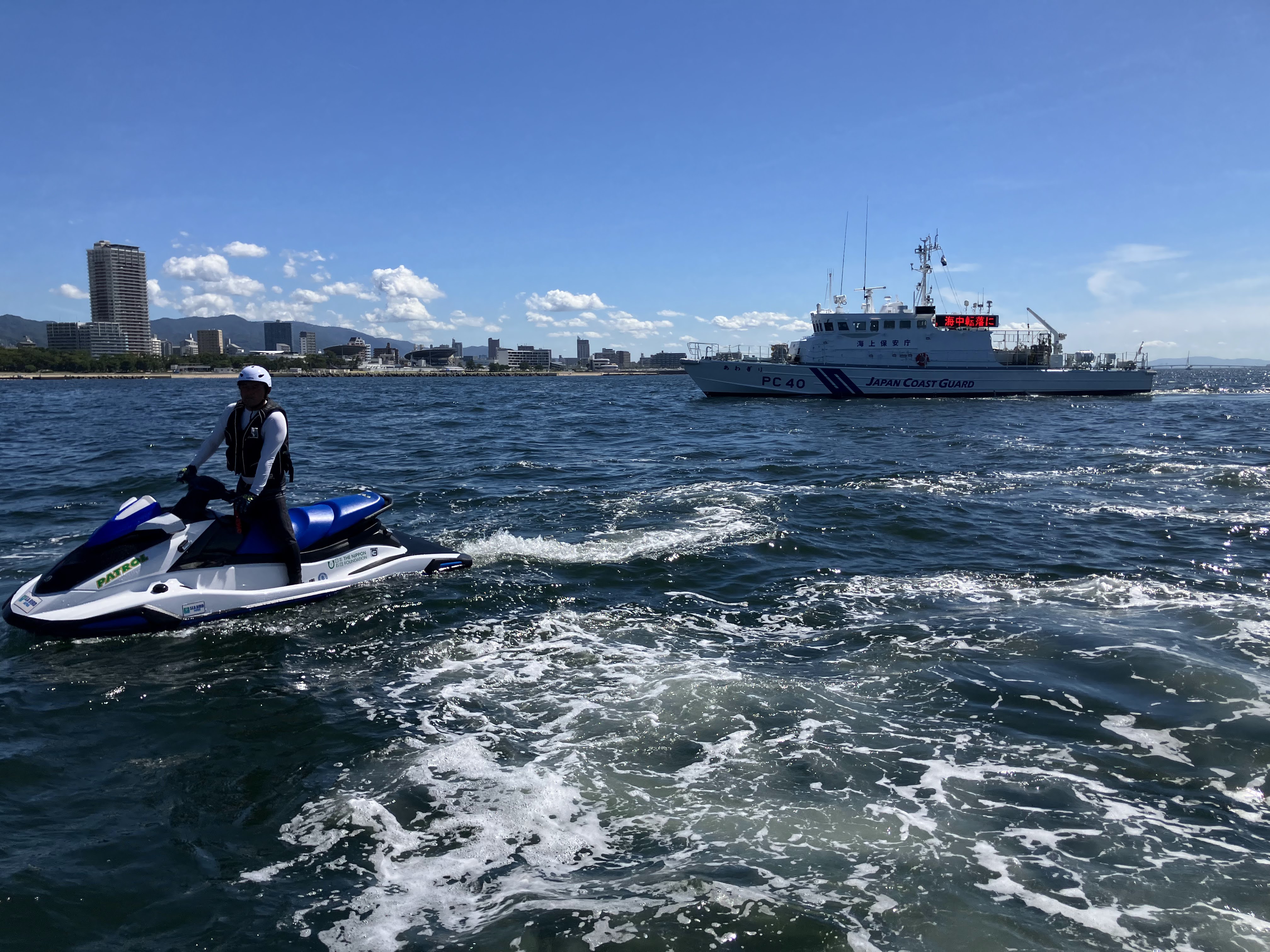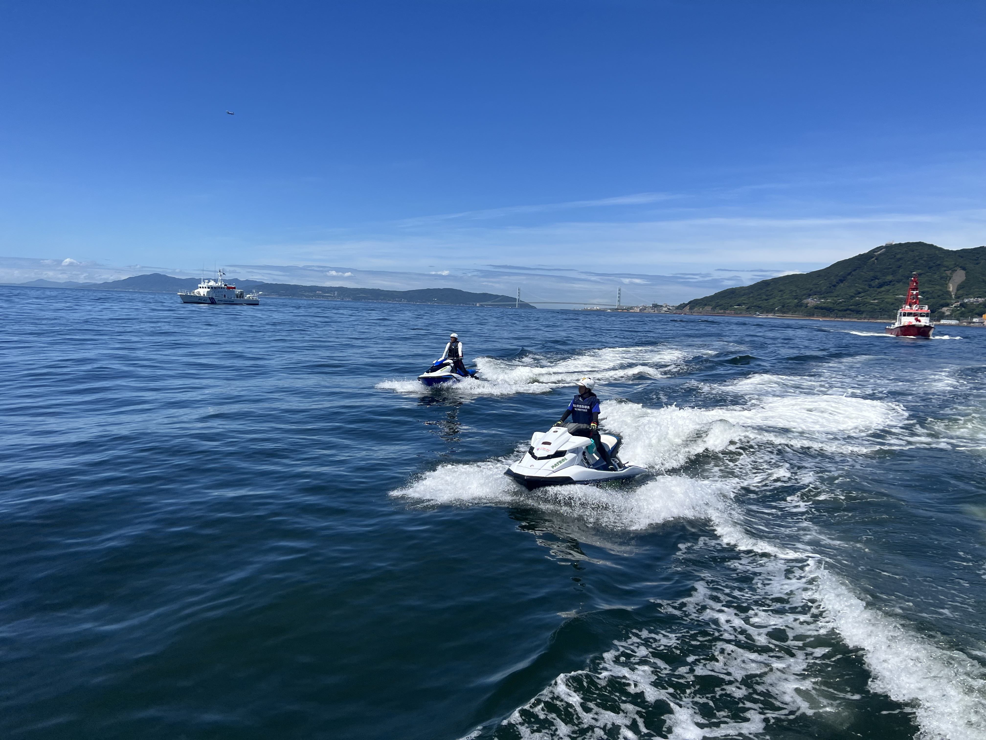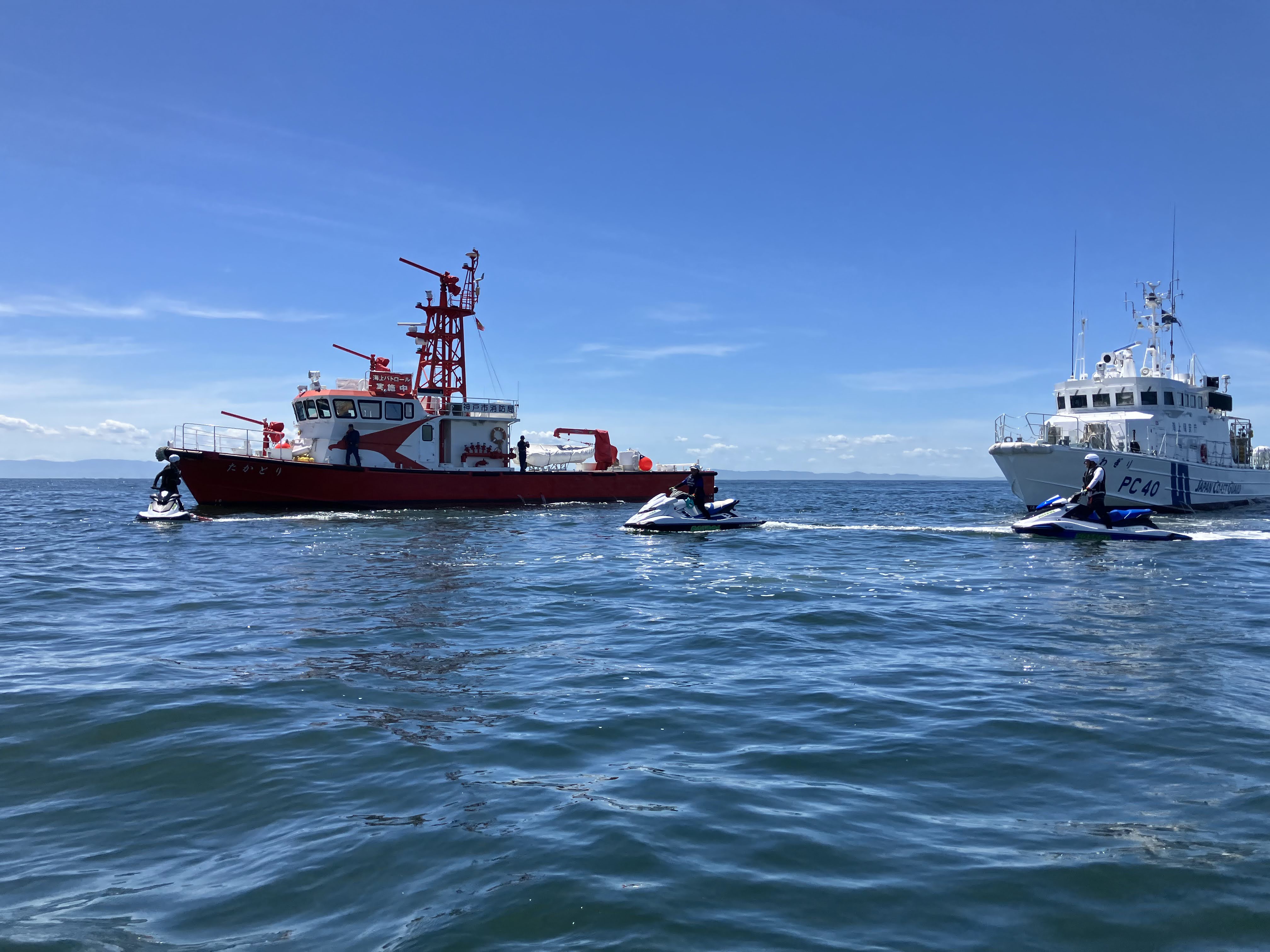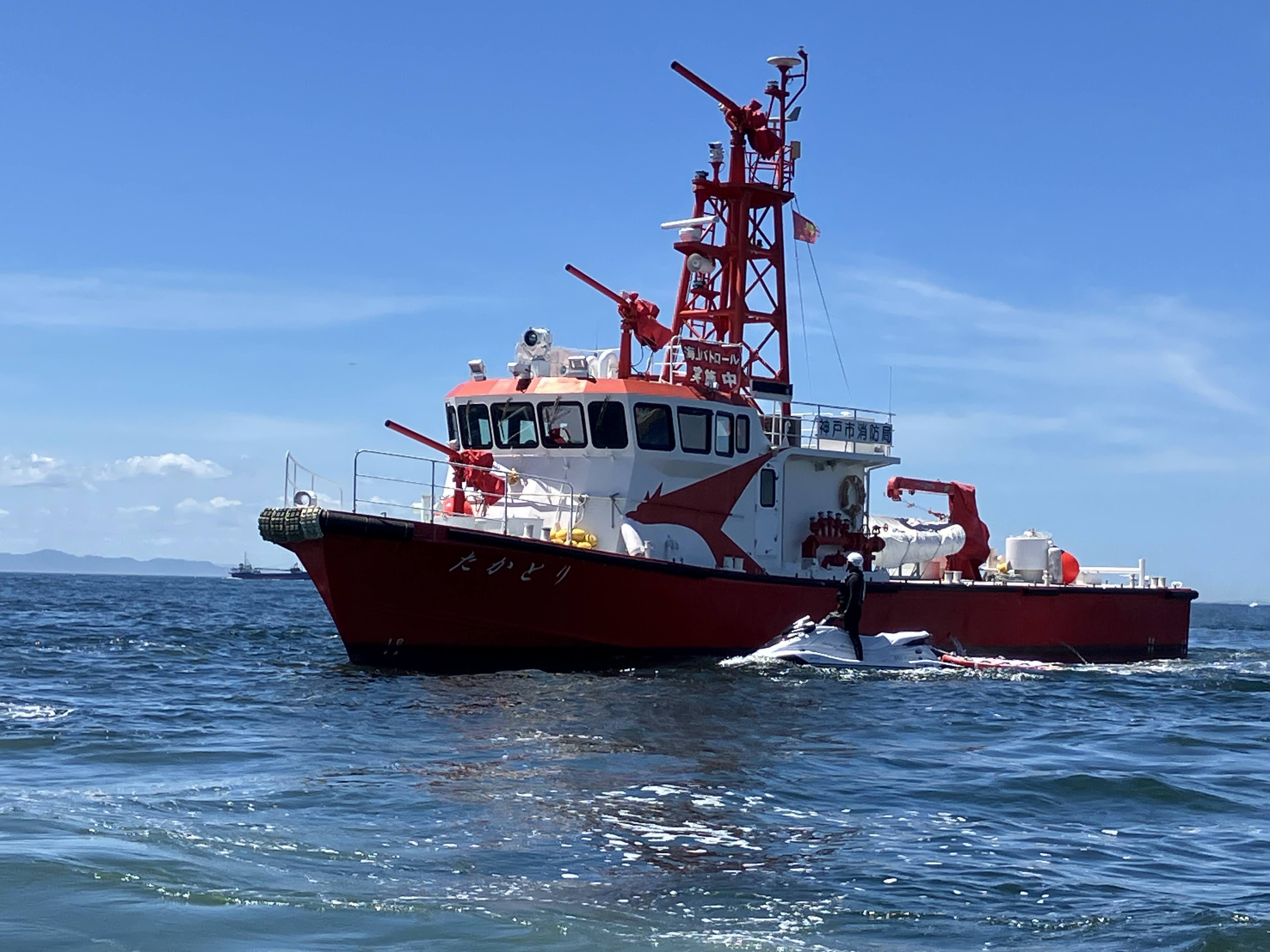 須磨ヨットハーバーを拠点に巡視艇「あわぎり」、消防艇「たかとり」、レスキュー艇「須磨レスキュー」、およびシーバードの水上バイク3隻の計6隻が出動。