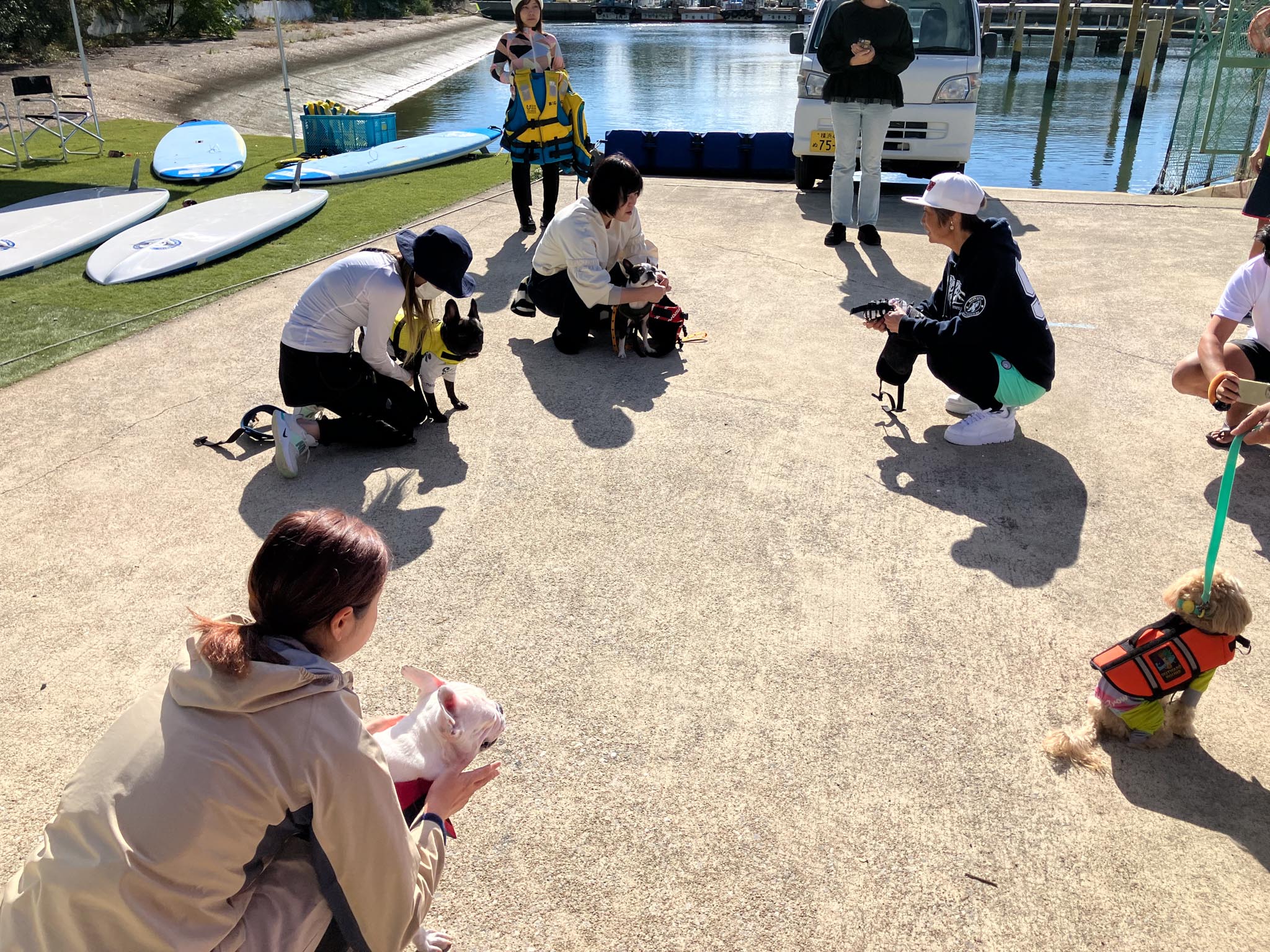 いよいよ水上へ!スタッフがサポートしながら、愛犬と一緒にボードに乗り込みます。ワンちゃんもライフジャケットを着用して準備万端です。