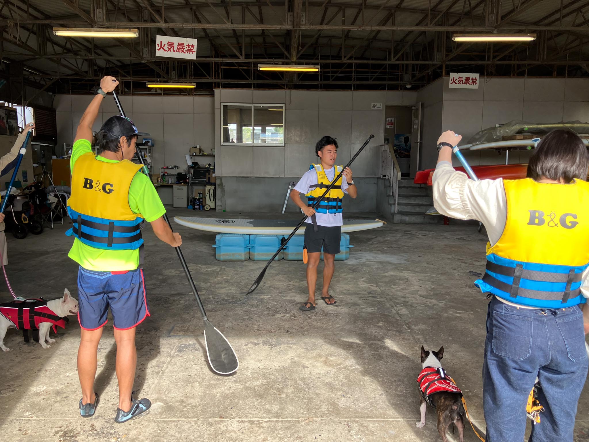 まずは陸上でレクチャーを受けます。SUPが初めての方でも安心なように、インストラクターがパドルの持ち方や漕ぎ方を丁寧に指導します。