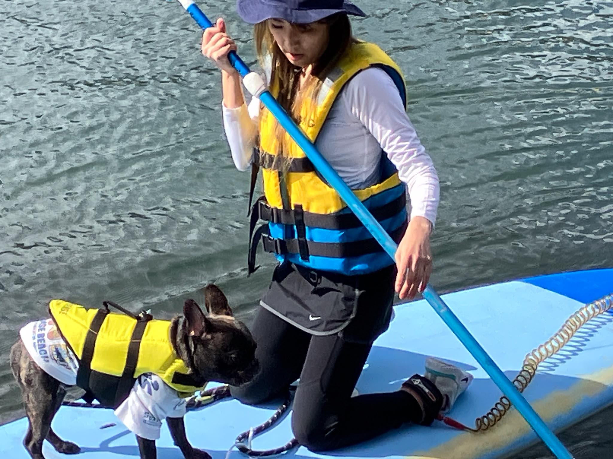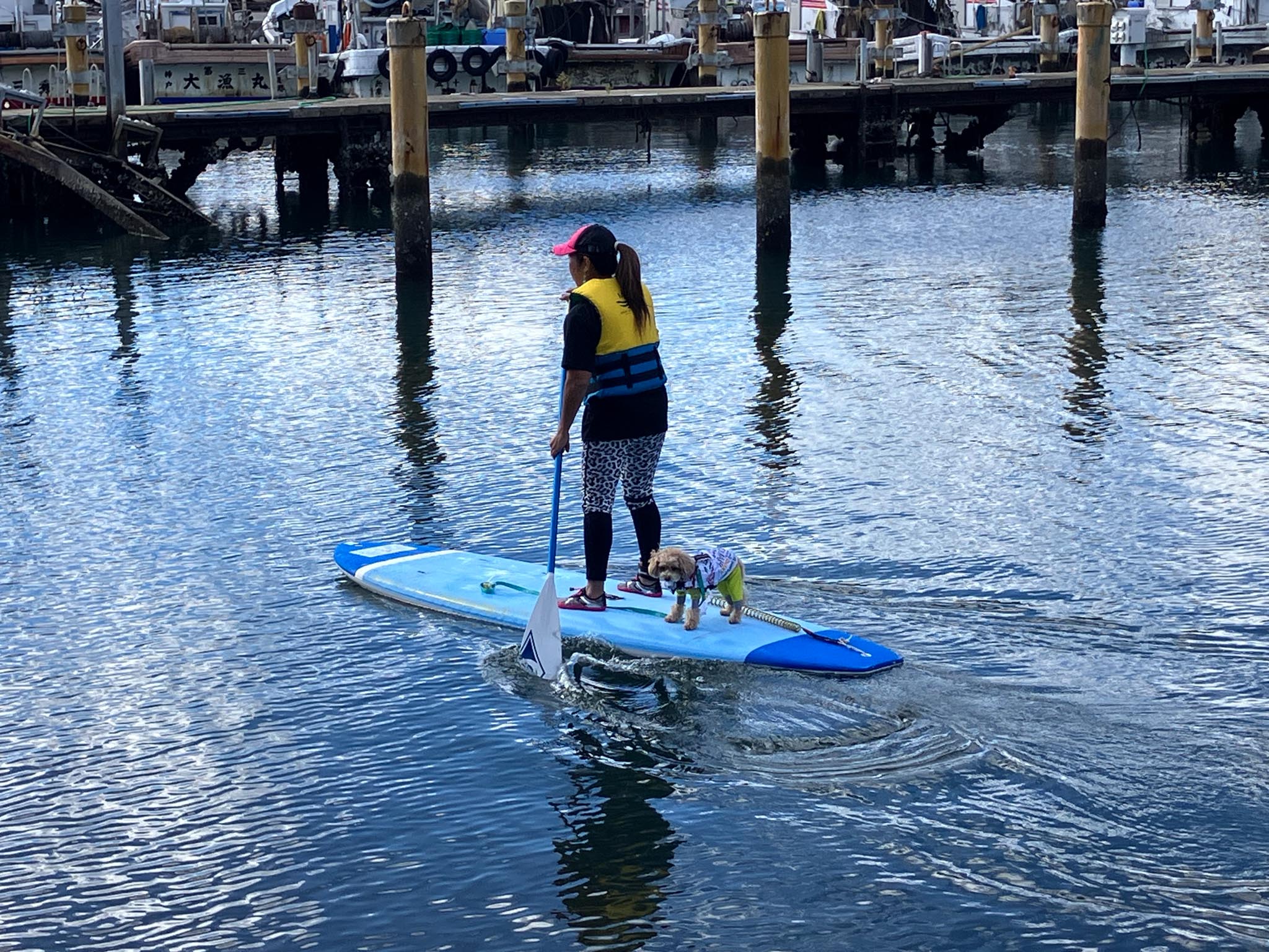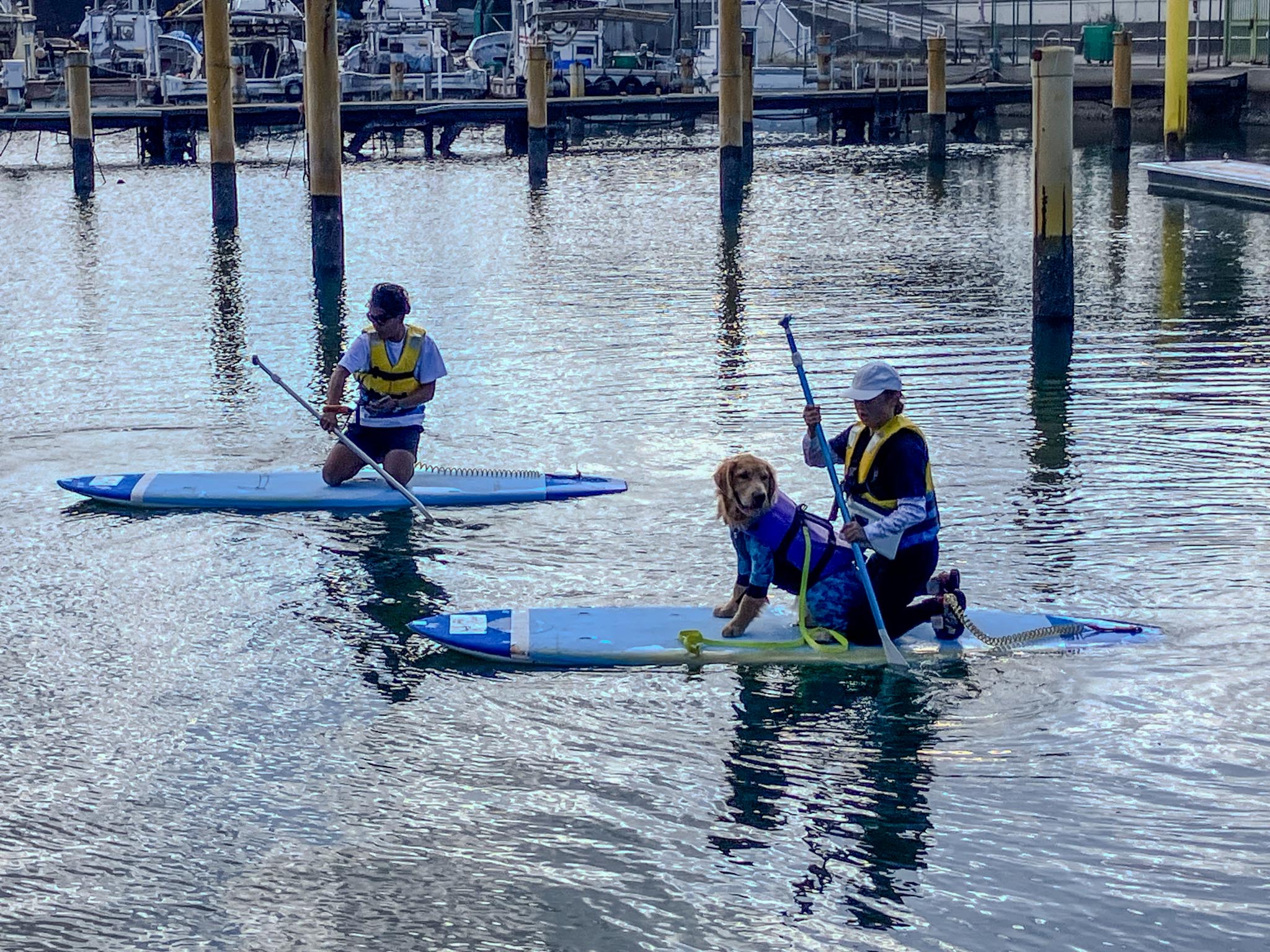 慣れてくると、ボードの上で立ち上がって漕ぐ参加者も。ハーバー内は波が穏やかなので、ワンちゃんもリラックスして水上散歩を楽しんでいました。