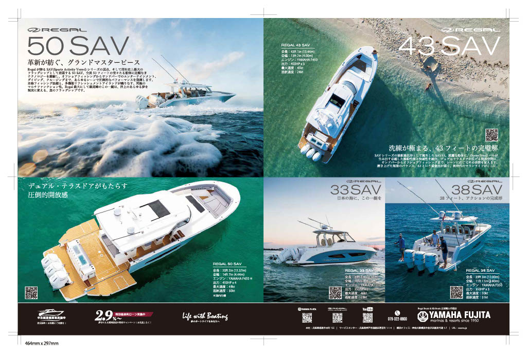 Regal Boatsのマルチユースボート「SAV(Sports Activity Vessel)」シリーズの最新ビジュアルが完成しました。50フィートのフラッグシップモデル「50 SAV」を中心に、「43 SAV」「38 SAV」「33 SAV」の4モデルが、クルージングからフィッシング、マリンアクティビティまで一艇で楽しめるボートとして登場します。